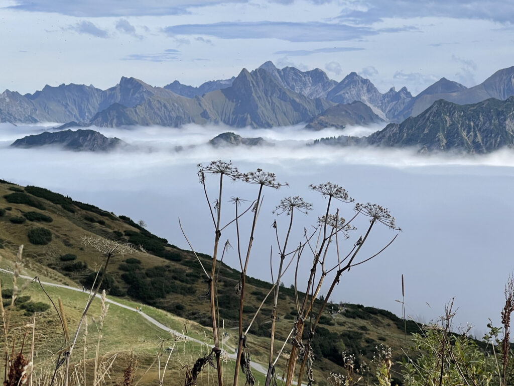 Auch am 3. Tag war es wieder wolkig, und deshalb sollte zunächst eine Talwanderung stattfinden. An der Bushaltestelle haben wir dann erfahren, dass oben auf dem Fellhorn die Sonne von einem strahlend blauen Himmel lacht. Ein Lob auf die Webcam! Eine Planänderung war schnell kommuniziert, und alle haben den sonnigen Tag auf dem Fellhorn, hoch über den Wolken, genossen.