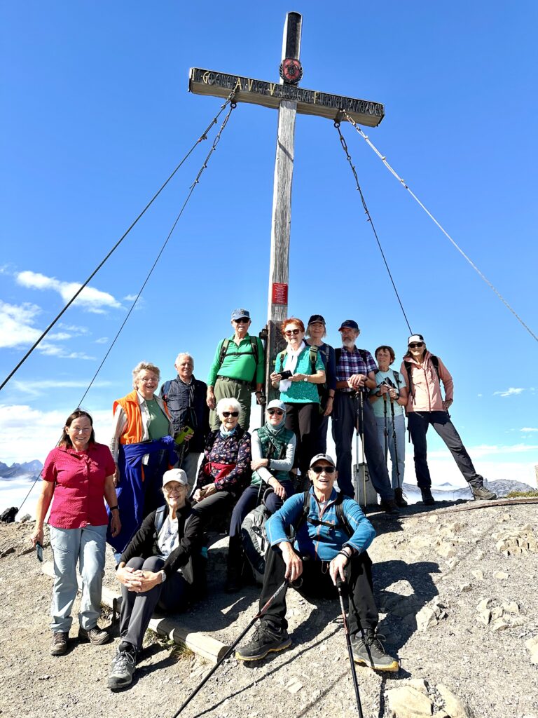 Am 1. Tag war das Wetter noch strahlend schön und so nahmen wir gleich den Gipfel des Nebelhorns in Angriff. Da der gesamte Aufstieg für die meisten Teilnehmer zu anstrengend gewesen wäre, wurde auf Teilstrecken auch die Nebelhornbahn genutzt. Auf diese Weise konnten alle das Gipfelglück und die tolle Aussicht genießen.